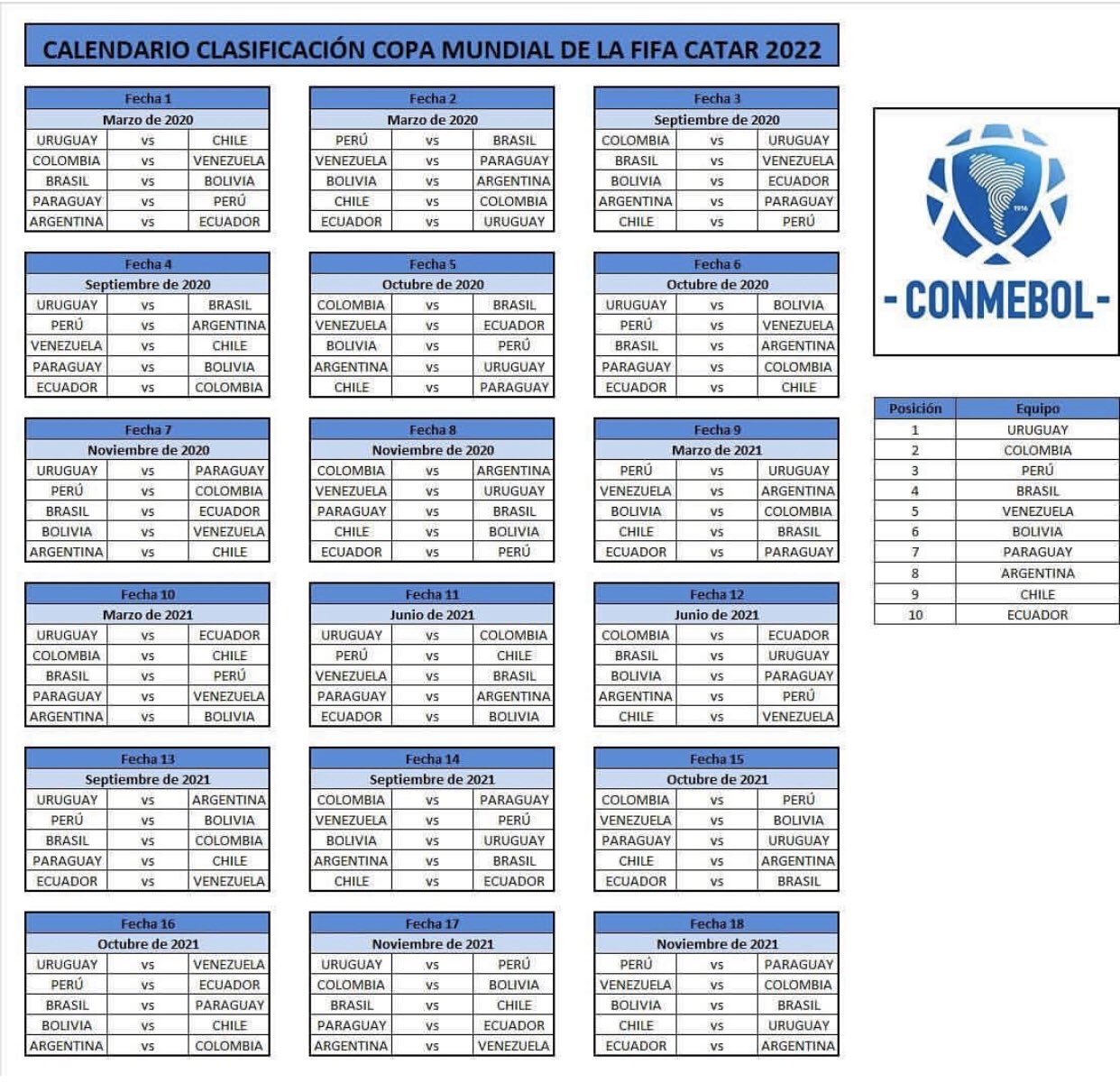 Arrancan en marzo y finalizan en noviembre de 2021. Eliminatorias Sudamericanas 2021. Se definió el calendario de todos los equipos sudamericanos en las eliminatorias al mundial de qatar 2022.